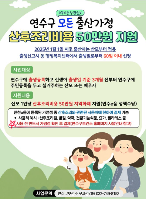 - 산모 1인당 50만 원의 산후조리비용을 연수e음 지역화폐로 지원합니다.